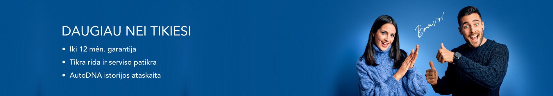 Naudoti automobiliai su garantija iš „Bravoauto“ – protingas būdas išsirinkti svajonių automobilį. Platus gamintojų pasirinkimas, įvairių kėbulų, skirti patogioms šeimos kelionėms ar darbui – mažai naudoti automobiliai čia randa savo šeimininkus. Mūsų salonuose Vilniuje, Kaune ir Klaipėdoje - išsamią patikrą perėję, patikimi naudoti automobiliai pateisins net ir reikliausius lūkesčius turinčius vairuotojus. Palankios įsigijimo sąlygos, draudimo ir lizingo pasiūlymai, visa pagalba registruojant bei transportuojant automobilius.